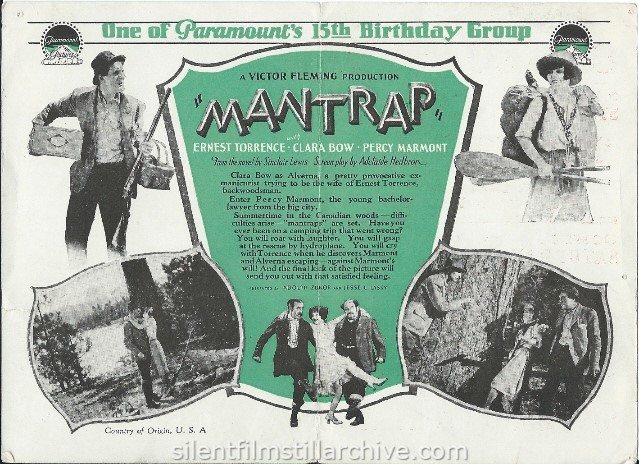 One of Paramount's 15th Birthday Group A VICTOR FLEMING PRODUCTION "MANTRAP" Clara Bow as Alverna, a pretty provocative ex-manicurist tryint to be the wife of Ernest Torrence, backwoodsman. Enter Percy marmont, the young bachelor-lawyer fromt the big city. Summertime in the Canadian woods --- difficulties arise -- "mantraps" are set. have you ever been on a camping trip that went wrong? You will roar with laughter. You will gasp at the rescue by hydroplane. You will cry with Torrence when he discovers Marmont and Alverna escaping -- against Marmont's will! And the final kick of the picture will send you out with that satisfied feeling. Presented by ADOLPH ZUKOR and JESSE L. LASKY with Clara Bow, Ernest Torrence and Percy Marmount. Directed by Victor Fleming. Paramount. More Information on this film...