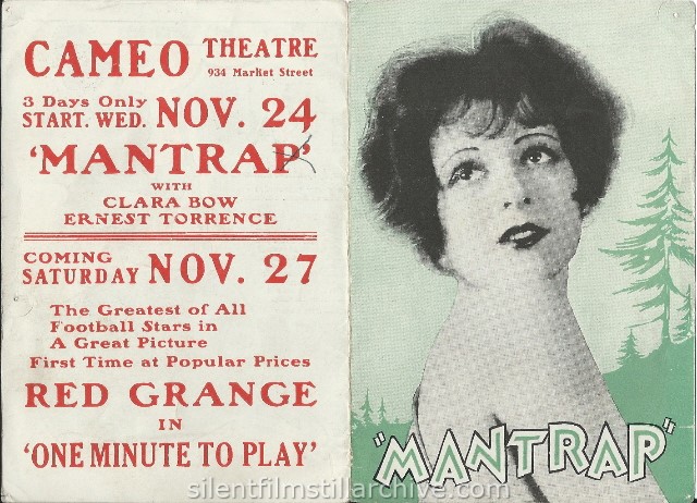 "MANTRAP" CAMEO THEATRE 3 Days Only. START. WED. NOV.24 (1926) 'MANTRAP' COMING SATURDAY NOV. 27 The Greatest of All Football Stars in A Great Picture RED GRANGE in