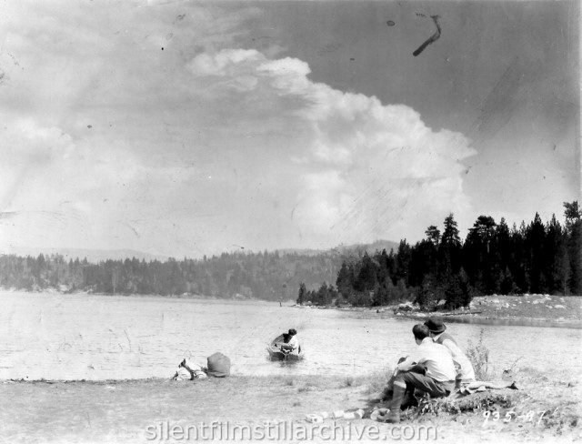 935-97 Clara Bow (in boat), Percy Marmont and Ernest Torrence sitting on the shore.