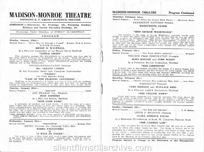 MADISON-MONROE THEATRE ADMISSION: -- Afternoons, 5c; Evenings, 10c, Excepting Sunday, Holidays and Special Attraction Evenings, 15c Orchestras Under Direction of SYDNEY BLUMENFELD PROGRAM Monday, January 29th -- Musical Number... "When They Go Through a Tunnel" ... Kalmar, Puck & Abrams K-E-S-E Presents HENRY B. WALTHALL In a Five-Act Adaption of the Famed Novel, Entitles "LITTLE SHOES" This photoplay presents Mr. Walthall in an entirely new type -- one he has never before developed so delightfully on the screen. "Little Shoes" is a drama of the heart, and the noted actor has thrown all of his wonderful emotional talent into a direct appeal of love. MARY CHARLESON portrays the leading feminine role in this visualization. INTERNATIONAL-PATHE Presents Mrs. VERNON CASTLE In the Photoplay Serial that Visualizes Americanism "PATRIA" The First Episode Being "LAST OF THE FIGHTING CHANNINGS" Thrilling in its presentation it brings you face to face with the problems that confronted our forefathers--for which they bled and died. It teaches the lessons of preparedness and patriotism as they have never been taught before. Tuesday, January 30th -- Musical Number........................... "ERNANI" ............................ Verdi ART DRAMAS, Inc., Presents JEAN SOTHERN In a Five-Act Drama, Entitled "HER GOOD NAME" A photoplay of sunshine and heart throbs. It tells the story of a sweet little country girl whose mother is dead, and whose father is a drunkard. Her father misunderstands her friendship with a young artist who is painting her portrait, and in a fit of drunken rage kills the man who, he thinks, has debauched his child. He is arrested for the murder, and the girl to save her father's life admits that her father was justified in committing the crime. "THE HIDDEN HAND" being the third episode of METRO'S POPULAR SERIAL, "THE GREAT SECRET," featuring FRANCIS X. BUSHMAN and BEVERLY BAYNE. Wednesday, January 31st -- Musical Number .......... "PIROUETTE" .......... Herman Fink METRO Presents the Charming Little Star MABEL TALIAFERRO The story of how a little Irish girl saves a man from unhappiness and at the same time gains happiness for herself. Although only "a wife by proxy," the nobility of Jerry's character becomes apparent and she wins the love of her husband. Thursday, February 1st -- Musical Number ..... "Down Where the Swanee River Flows" ..... Broadway Music PARAMOUNT PICTURES Present MARGUERITE CLARK The mention of the name of George Washington probably recalls more vividly to mind the cherry tree incident than the fact that he was the savior of his country, so thoroughly has that story instilled into the minds of the youth of the country. Therefore, "Miss George Washington," conjures up one of two pictures -- a girl who cannot tell a lie, or a girl who cannot tell the truth. In this case the producers have chosen to parody the name and the story deals with one of the most accomplished little fibbers and mischief makers that one could imagine. Friday, February 2d-- Musical Number .......... "The Pearl Maiden Selection" .......... Whitmark TRIUMPH FILM CORPORATION Presents ALMA HANLON and JOHN MASON In a Powerful Six-Act Production, Entitled "THE LIBERTINE" A larger part of this feature visualizes the dream of a young woman who is about to make a great mistake, but who recovers her moral dignity just before it is too late. The play teems with action and dramatic swiftness, arousing the interest of the spectator and holding every inch of the way. Saturday, February 3d-- Musical Number .......... "There's Someone More Lonesome Than You" .......... Von Tilzer PARAMOUNT Presents CLEO RIDGLEY and WALLACE REID In a Five-Act LASKY Production, Entitled "THE YELLOW PAWN" Filled with tense situations and dramatic surprises this story shows the length to which prosecuting officials will go to wring a confession; "the third degree" proves a boomerang. An artist in love with the wife of a district-attorney--a Japanese servant--a murder--complex incidents all handled logically and effectively. Sunday, February 4th--