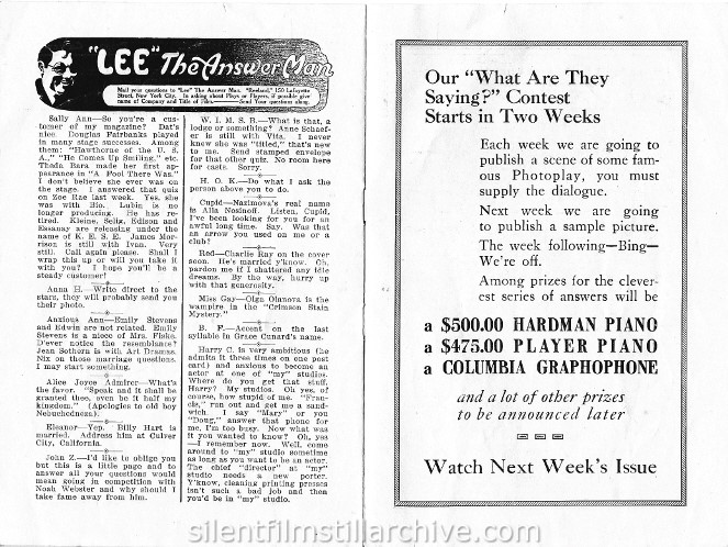 "Lee" The Answer Man Mail your questions to "Lee" The Answer Man. "Reeland," 150 Lafayette Street, new York City. In asking about Plays or Players, if possible give name of Company and Title of Film. -- Send your question along. Sally Ann -- So you're a customer of my magazine? Dat's nice. Douglas Fairbanks played in many stage successes. Among them: "Hawthorne of the U. S. A.," "He Comes Up Smiling, " etc. Theda Bara made her first appearance in"A Fool There Was." I don't believe she ever was on the stage. I answered that quiz on Zoe Rae last week. Yes, she was with Bio (Biograph). Lubin is no longer producing. He has retired. Kleine, Selig, Edison and Essanay are releasing under the name of K. E. S. E.. James Morrison is still with Ivan. Very still. Call again please. Shall I wrap this up or will you take it with you? Anna H. -- Write direct to the stars, they will probably send you their photo. Anxious Ann -- Emily Stevens and Edwin are not related. Emily Stevens is a niece of Mrs. Fiske. D'ever notice the resemblance? Nix on those marriage questions. I may start something. Alice Joyce Admirer -- What's the favor. "Speak and it shall be granted thee, even be it half my kingdom". (Apoligies to old boy Nebuchedneza). Eleanor -- Yep. Billy hart is married. Address him at Culver City, California. John Z. -- I'd like to oblige you but this is a little page and to answer all your questions would mean going in competition with Noah Webster and why should I take fame away from him. W. I. M. S. B. -- What is that, a lodge or something? Anne Schaefer is still with Vita. I never knew she was "titled," that's new to me. Send stamped envelope for that other quiz. No room here for casts. Sorry. H. O. K -- Do what I ask the person above you to do. Cupid -- Nazimova's real name is Alla Nosinoff. Listen, Cupid, I've been looking for you for an awful long time. Say. Was that an arrow you used on me or a club? Red -- Charlie Ray on the cover soon. He's married y'know. Oh, pardon me if I shattered any idle dreams. By the way, hurry up with that generosity. Miss Gay -- Olga Olanova is the wampire (sic) in the "Crimson Stain Mystery." B. F. -- Accent on the last syllable in Grace Cunard's name. Harry C. is very ambitions (he admits it three times on one post card) and anxious to become an actor at oneof "my" studios. Where do you get that stuff, harry? My studios? Oh yes, of course, how stupid of me. "Francis," runout and get me a sandwich. I say "Mary" or you "Doug," answer that phone for me, I'm too busy. Now what was it you wanted to know? Oh, yes -- I remember now Well, come around to "my" studio sometime as long as you want to be an actor. The chief "director" at "my" studio needs a new porter. Y'know, cleaning printing presses isn's such a bad job and then you'd be in "my" studio. Our "What Are They Saying?" Contest Starts in Two Weeks Each week we are going to publish a scene of some famous Photoplay, you must supply the dialogue. Next week we are going to publish a sample picture. The week following -- Bing -- We're off. Among prizes for the cleverest series of answers will be a $500.00 HARDMAN PIANO a $475 PLAYER PIANO a COLUMBIA GRAPHOPHONE and a lot of other prizes to be announced later Watch Next Week's Issue